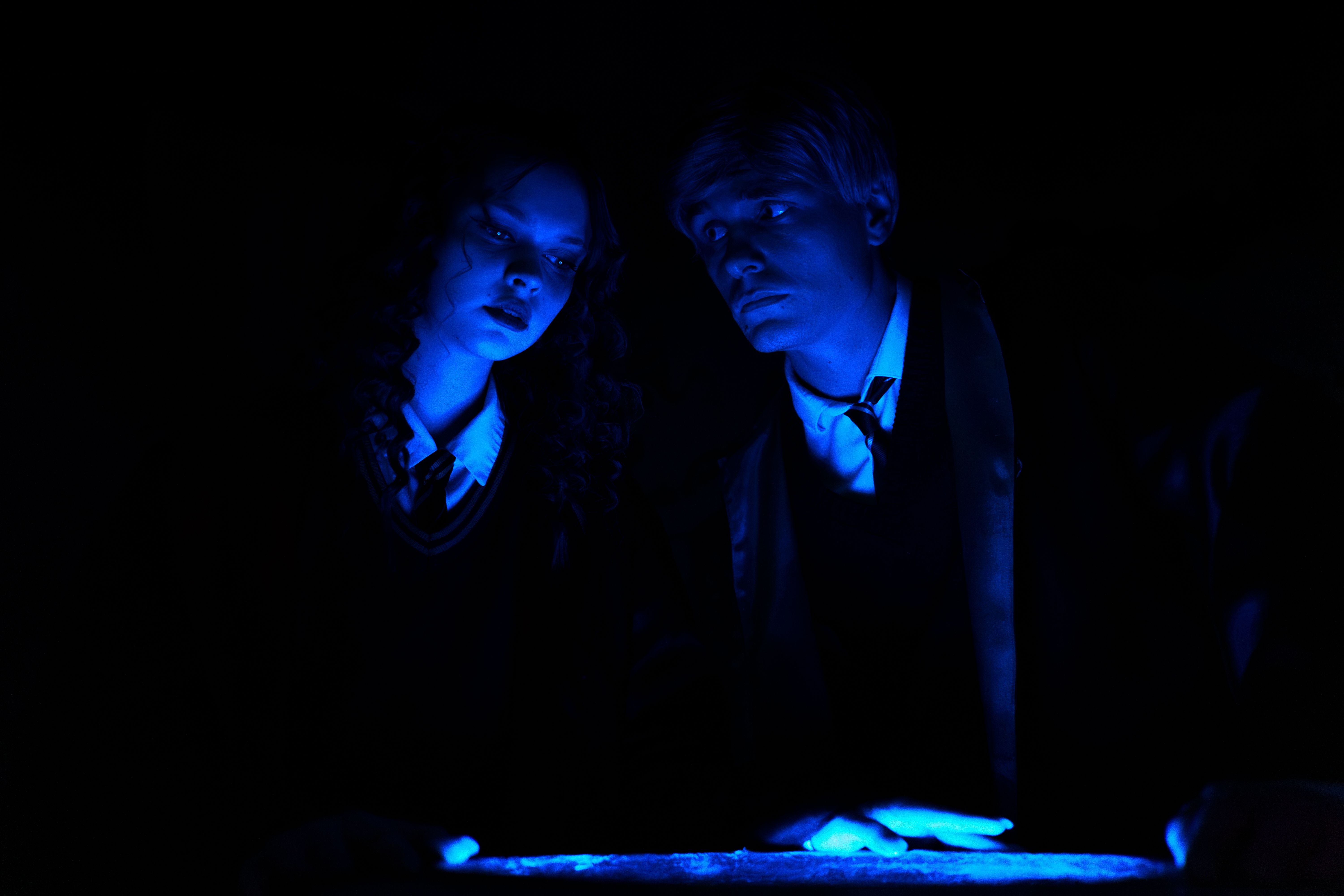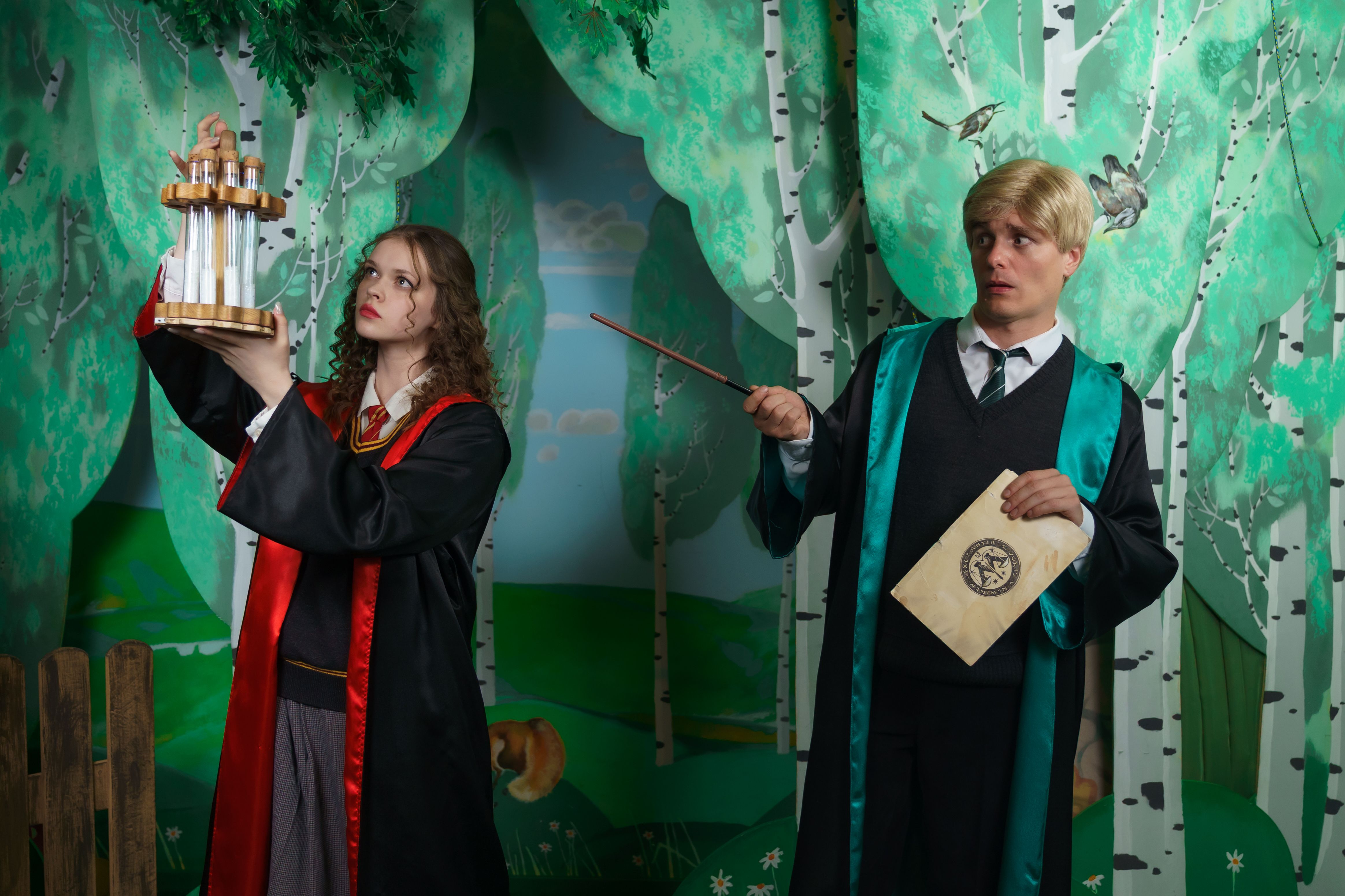 Спектакль проходит в сопровождении 2 актеров. Возможные герои: Гарри Поттер, Гермиона Грейнджер, Драко Малфой, профессора Северус Снейп, Минерва МакГонагал и Сивилла Трелони.